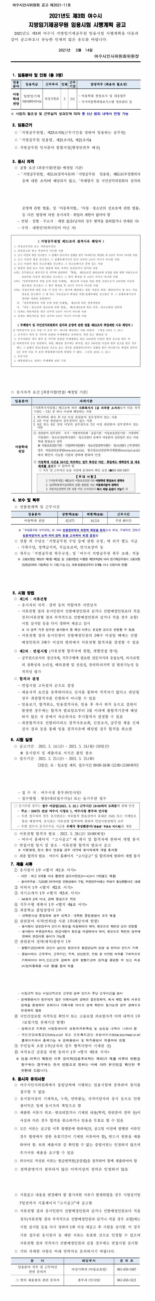 전남 여수시 지방임기제공무원 임용시험 시행계획 공고(~5.25) 페이지 정보 작성자 관리자 댓글 0건 조회 2,142회 작성일 21-05-21 15:01 목록 본문 이전글광주지방검찰청 일반직공무원(방호서기보) 경력경쟁채용시험 시행계획 공고(~5.27) 21.05.21 다음글2021 인사혁신처 국가공무원 7급 공개경쟁채용 필기시험 시도별 시험장소 예정지 안내 21.05.21 댓글 0 댓글목록 등록된 댓글이 없습니다.