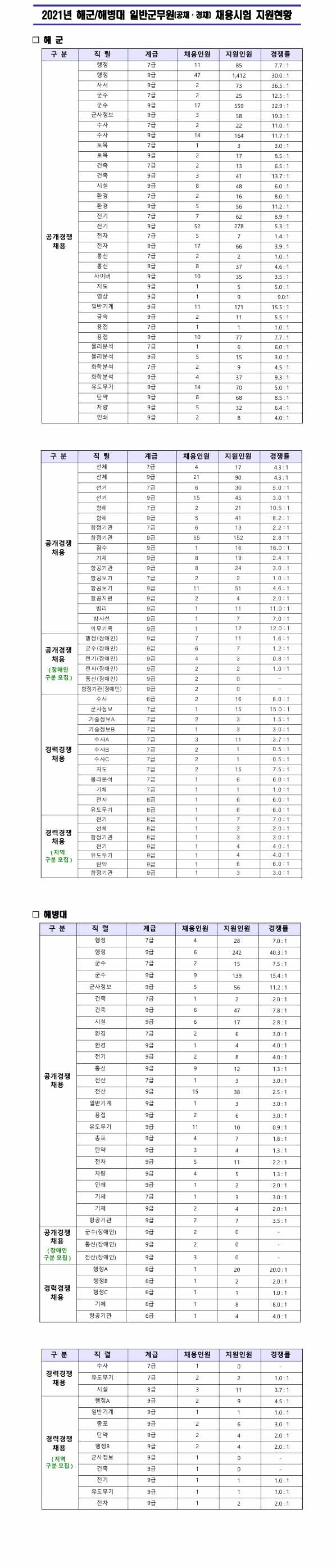 ★ 2021 해군/해병대 일반군무원(공채.경채) 채용시험 경쟁률 페이지 정보 작성자 관리자 댓글 0건 조회 2,811회 작성일 21-05-21 15:06 목록 본문 이전글2021 제19회 국회사무처 8급 공개경쟁채용시험 필기시험 합격자 및 면접시험 공고 21.05.21 다음글광주시 북구 시간선택제임기제공무원 채용계획 공고(~6.2) 21.05.21 댓글 0 댓글목록 등록된 댓글이 없습니다.