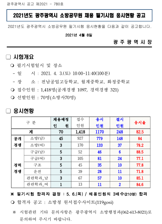 ★ 2021 광주시 소방공무원 채용 필기시험 응시율 페이지 정보 작성자 관리자 댓글 0건 조회 2,779회 작성일 21-04-13 17:18 목록 본문 이전글광주지방검찰청 순천지청 청원경찰 채용시험 시행계획 공고(~4.29) 21.04.13 다음글★ 2021 법원행정처 9급 공개경쟁채용시험 최종합격자 관련 통계 21.04.09 댓글 0 댓글목록 등록된 댓글이 없습니다.