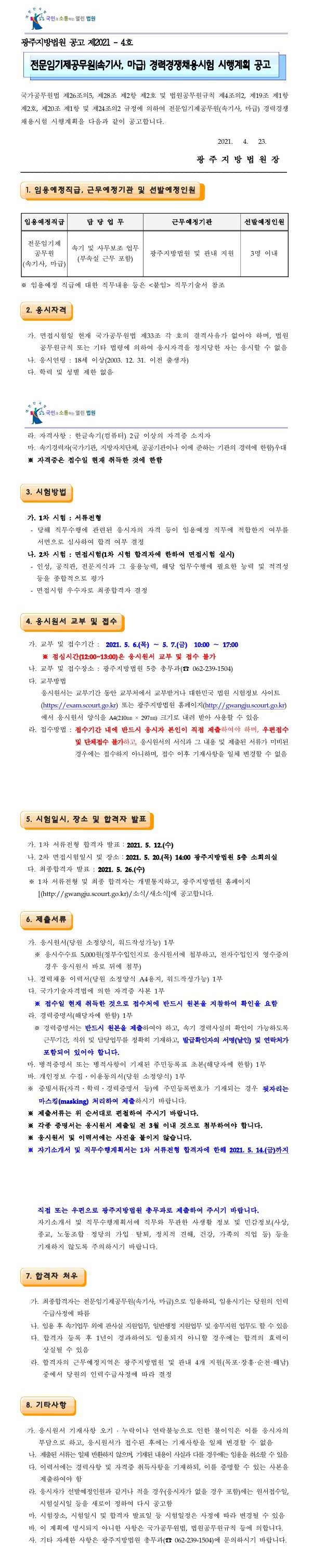 광주지방법원 전문임기제공무원(속기사, 마급) 경력경쟁채용시험 시행계획 공고(~5.7) 페이지 정보 작성자 관리자 댓글 0건 조회 2,180회 작성일 21-04-27 09:49 목록 본문 이전글☆ 2021 제2차 질병관리청 및 보건복지부 보건직공무원 경력경쟁채용 공고(~5.6) 21.04.27 다음글2021 인사혁신처 국가공무원 7급 민간경력자 일괄채용시험 시행계획 공고(~6.7) 21.04.27 댓글 0 댓글목록 등록된 댓글이 없습니다.