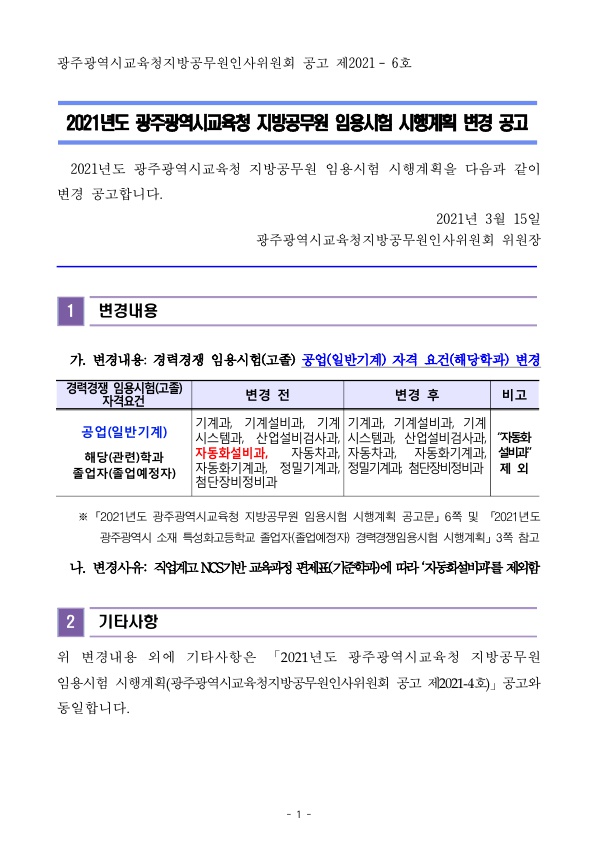 ★ 2021 광주시교육청 지방공무원 임용시험 시행계획 변경 공고 페이지 정보 작성자 관리자 댓글 0건 조회 2,461회 작성일 21-03-26 08:48 목록 본문 이전글전남교육청 일반임기제공무원 채용시험 시행계획 공고(~3.26) 21.03.26 다음글★ 2021 인사혁신처 국가공무원 9급 공개경쟁채용시험 경쟁률 21.03.26 댓글 0 댓글목록 등록된 댓글이 없습니다.