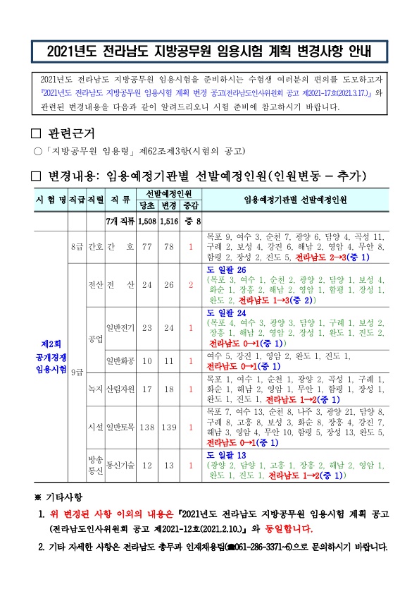 ★ 2021 전남 지방공무원 임용시험 계획 변경 공고 페이지 정보 작성자 관리자 댓글 0건 조회 2,417회 작성일 21-03-26 08:52 목록 본문 이전글★ 2021 국가정보원 정기공채 채용 공고(~5.13) 21.03.26 다음글★ 2021 법원행정처 9급 공개경쟁채용 제1·2차 시험 합격자 현황 21.03.26 댓글 0 댓글목록 등록된 댓글이 없습니다.