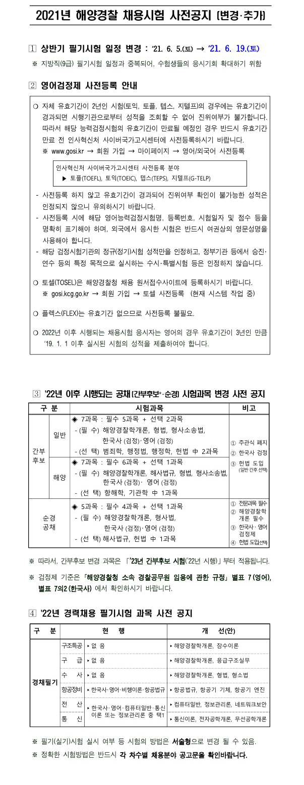 ★ 2021 해양경찰청 채용시험 사전공지(변경.추가) 페이지 정보 작성자 관리자 댓글 0건 조회 2,475회 작성일 21-03-26 08:57 목록 본문 이전글★ 2021 우정사업본부 우정9급(계리) 공무원 공개경쟁채용 필기시험 응시율 21.03.26 다음글2021 전남 소재 특성화고 및 마이스터고 졸업(예정)자 경력경쟁임용시험 공고(~4.23) 21.03.26 댓글 0 댓글목록 등록된 댓글이 없습니다.