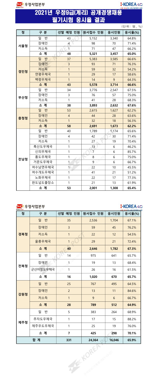 ★ 2021 우정사업본부 우정9급(계리) 공무원 공개경쟁채용 필기시험 응시율 페이지 정보 작성자 관리자 댓글 0건 조회 2,668회 작성일 21-03-26 08:59 목록 본문 이전글경찰병원 국가직공무원 경력경쟁채용 공고(~4.5) 21.03.26 다음글★ 2021 해양경찰청 채용시험 사전공지(변경.추가) 21.03.26 댓글 0 댓글목록 등록된 댓글이 없습니다.
