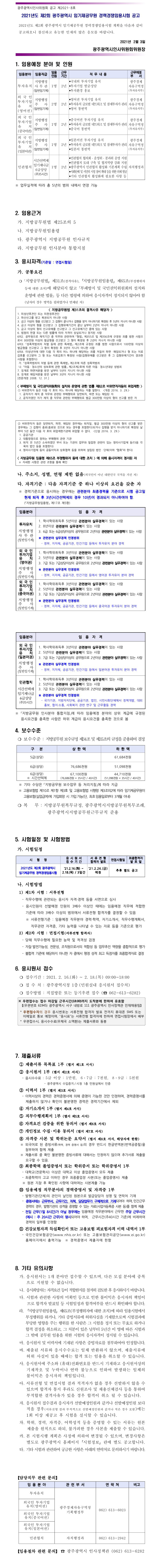 광주시 임기제공무원 경력경쟁임용시험 공고(~2.18) 페이지 정보 작성자 관리자 댓글 0건 조회 2,323회 작성일 21-02-09 10:02 목록 본문 이전글2021 제27기 중앙소방학교 소방간부후보생 선발 필기시험 합격선 21.02.09 다음글★ 2020 각 시.도 지방공무원 7급 공채시험 경쟁률 21.02.02 댓글 0 댓글목록 등록된 댓글이 없습니다.