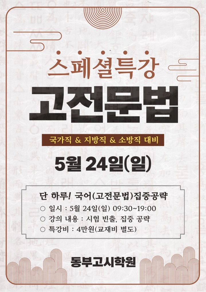[5월 24일] 고전문법 하루특강 - 국가직/지방직/소방직 대비 페이지 정보 작성자 관리자 댓글 0건 조회 1,923회 작성일 20-05-09 17:05 목록 본문 이전글[총정리] 마무리 특강 (6/1~6/14) - 지방직/소방직/국가직 대비 20.05.09 다음글[4월 29일] 문제풀이반 [국가직/지방직/소방직 대비] 20.04.14 댓글 0 댓글목록 등록된 댓글이 없습니다.