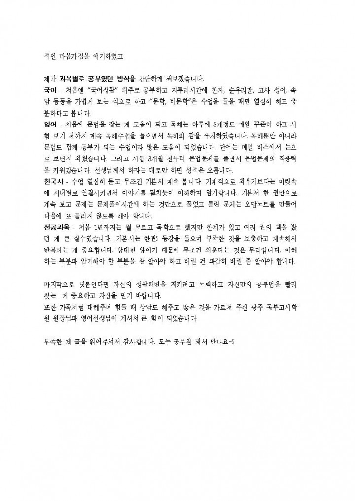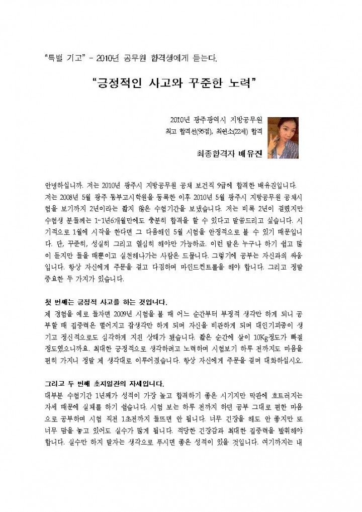 2010년 합격수기 - 광주지방직 최연소(22세), 최고합격선(95점) 합격 페이지 정보 작성자 관리자 댓글 0건 조회 2,493회 작성일 10-09-16 17:49 목록 본문 아래를 클릭하시면 크게 보실 수 있습니다. 이전글2010 서울시 신규 공무원 임용시험, 동부고시 최종합격자 [총 52명] 10.09.17 다음글9월 1일(수) 첫진도 개강반 안내 10.08.05 댓글 0 댓글목록 등록된 댓글이 없습니다.