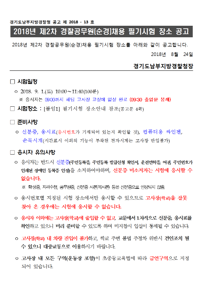 [경기 남부] 2018년 제2차 경찰공무원(순경)채용 필기시험 장소 공고