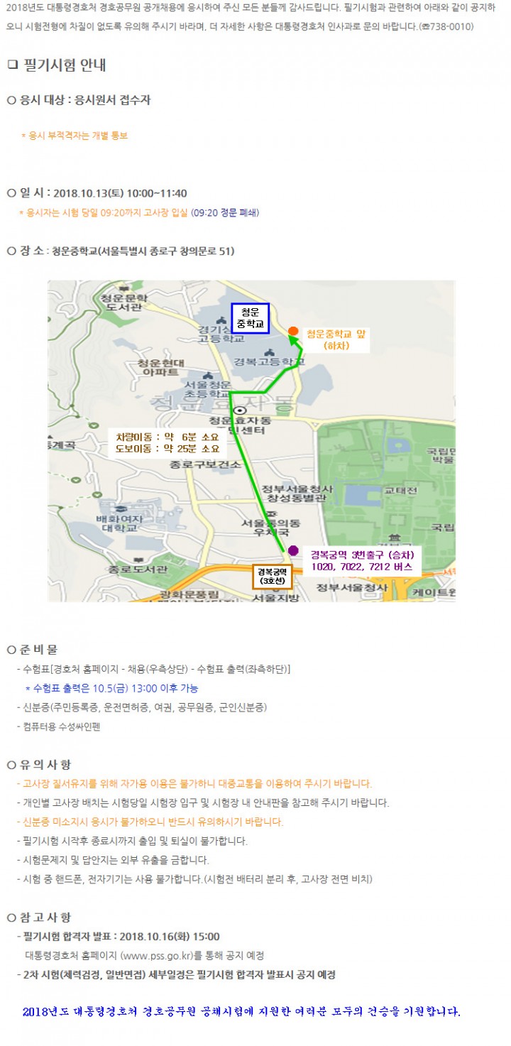 2018 대통령경호처 7급 경호공무원 공채 필기시험 안내 페이지 정보 작성자 관리자 댓글 0건 조회 1,023회 작성일 18-10-10 08:27 목록 본문 [이 게시물은 관리자님에 의해 2018-10-10 08:28:34 최근시험공고문에서 복사 됨] 이전글전남 여수시 청원경찰 채용시험 계획 공고(~11.2) 18.10.30 다음글법원행정처 법원보안관리대원(별정직, 9급상당) 경력경쟁채용시험 시행계획 공고(~10.22) 18.10.10 댓글 0 댓글목록 등록된 댓글이 없습니다.
