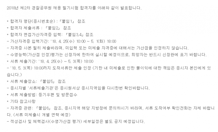 [해양경찰] 2018년 제2차 경찰공무원 채용 필기시험(공채) 합격자 공지