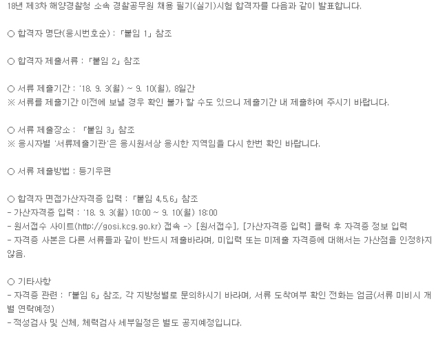 - 이전글2019 해양경찰청 간부후보생 채용 필기시험 합격자 18.08.22
