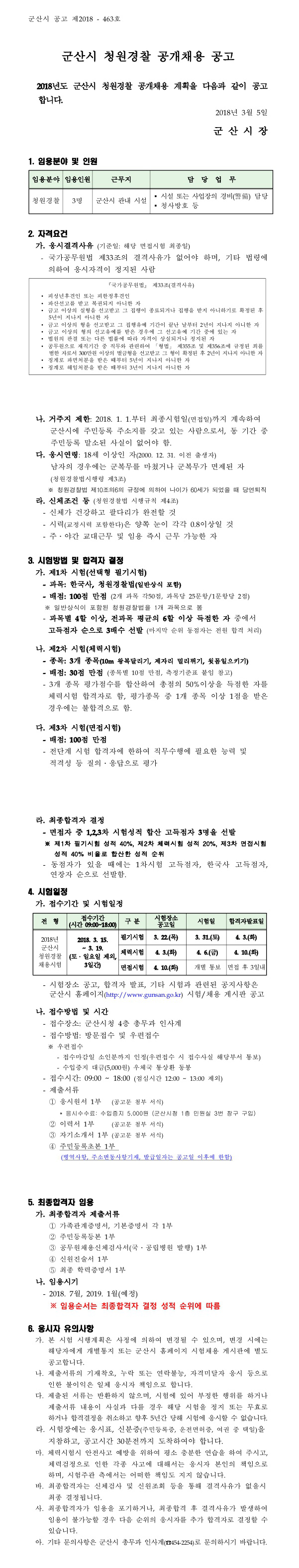 전북 군산시 청원경찰 공개채용 공고(~3.19) 페이지 정보 작성자 관리자 댓글 0건 조회 1,771회 작성일 18-03-05 16:24 목록 본문 이전글울산지방검찰청 청원경찰 경력경쟁채용시험 공고(~3.21) 18.03.06 다음글☆ 2018 제2차 해양경찰청 경찰공무원(순경-특임(구조)분야) 채용시험 공고(~3.15) 18.03.02 댓글 0 댓글목록 등록된 댓글이 없습니다.