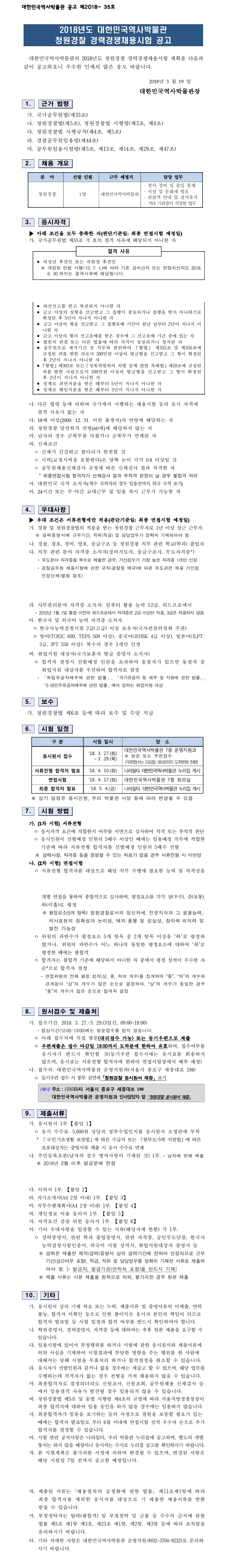 대한민국역사박물관 청원경찰 경력경쟁채용시험 공고(~3.29) 페이지 정보 작성자 관리자 댓글 0건 조회 1,921회 작성일 18-03-20 18:08 목록 본문 이전글2018 경찰청 경찰공무원 채용 가산점 인정 무도단체 현황(18. 3. 21. 기준) 18.03.23 다음글2018 제2차 해양경찰청 소속 경찰공무원 및 일반직공무원 채용 경쟁률 18.03.20 댓글 0 댓글목록 등록된 댓글이 없습니다.