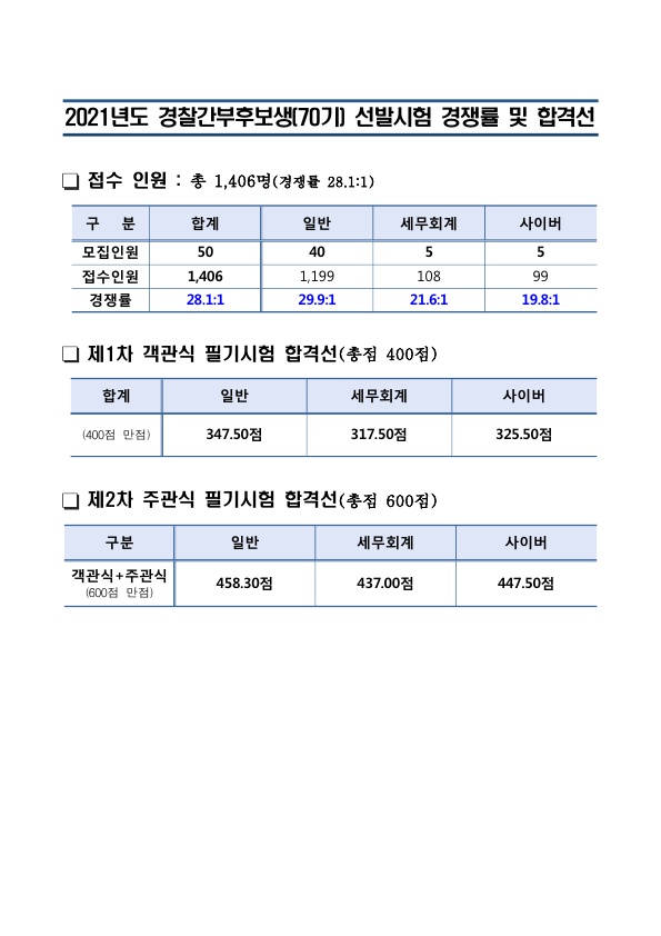 ★ 2021 제70기 경찰간부후보생 선발시험 경쟁률 및 합격선 페이지 정보 작성자 관리자 댓글 0건 조회 1,690회 작성일 20-11-06 17:10 목록 본문 [이 게시물은 관리자님에 의해 2020-11-06 17:10:38 최근시험공고문에서 복사 됨] 이전글광주시 북구 청원경찰 임용시험 시행계획 공고(~11.24) 20.11.23 다음글2021 제70기 경찰간부후보생 선발 필기시험 합격자 공고 20.10.26 댓글 0 댓글목록 등록된 댓글이 없습니다.