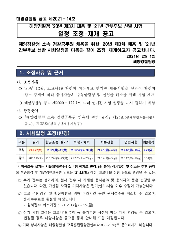 ★ 해양경찰청 2020 제3차 경찰공무원 채용 및 2021 간부후보 선발시험 일정 조정.재개 페이지 정보 작성자 관리자 댓글 0건 조회 1,778회 작성일 21-02-02 14:20 목록 본문 [이 게시물은 관리자님에 의해 2021-02-02 14:21:04 최근시험공고문에서 복사 됨] 이전글☆ 2021 상반기 경찰청 경찰공무원 경력경쟁채용시험 공고(~2.15) 21.02.09 다음글★ 2021 해양경찰청 소속 공무원 채용계획 및 응시자격 등 안내 21.02.02 댓글 0 댓글목록 등록된 댓글이 없습니다.