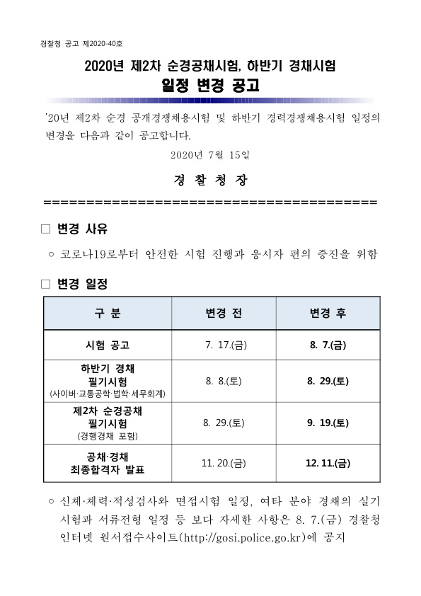 ★ 2020 경찰청 제2차 순경 공채시험, 하반기 경채시험 일정 변경 공고 페이지 정보 작성자 관리자 댓글 0건 조회 1,547회 작성일 20-07-17 07:55 목록 본문 [이 게시물은 관리자님에 의해 2020-07-17 07:55:59 최근시험공고문에서 복사 됨] 이전글★ 2020 제1차 경찰청 경찰공무원(순경) 채용 필기시험 합격선 20.08.17 다음글★ 2020 제1회 경찰청 일반직공무원 경력경쟁채용시험 공고(~7.6) 20.07.01 댓글 0 댓글목록 등록된 댓글이 없습니다.