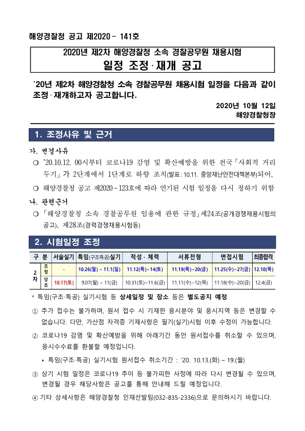2020 제2차 해양경찰청 소속 경찰공무원 채용시험 일정 조종.재개 공고 페이지 정보 작성자 관리자 댓글 0건 조회 1,548회 작성일 20-10-26 15:55 목록 본문 [이 게시물은 관리자님에 의해 2020-10-26 15:56:12 최근시험공고문에서 복사 됨] 이전글☆ 2020 전남 청원경찰 채용시험 경쟁률 20.10.26 다음글전남지방우정청 우정9급(집배) 공무원 경력경쟁채용시험 공고(~10.22) 20.10.26 댓글 0 댓글목록 등록된 댓글이 없습니다.