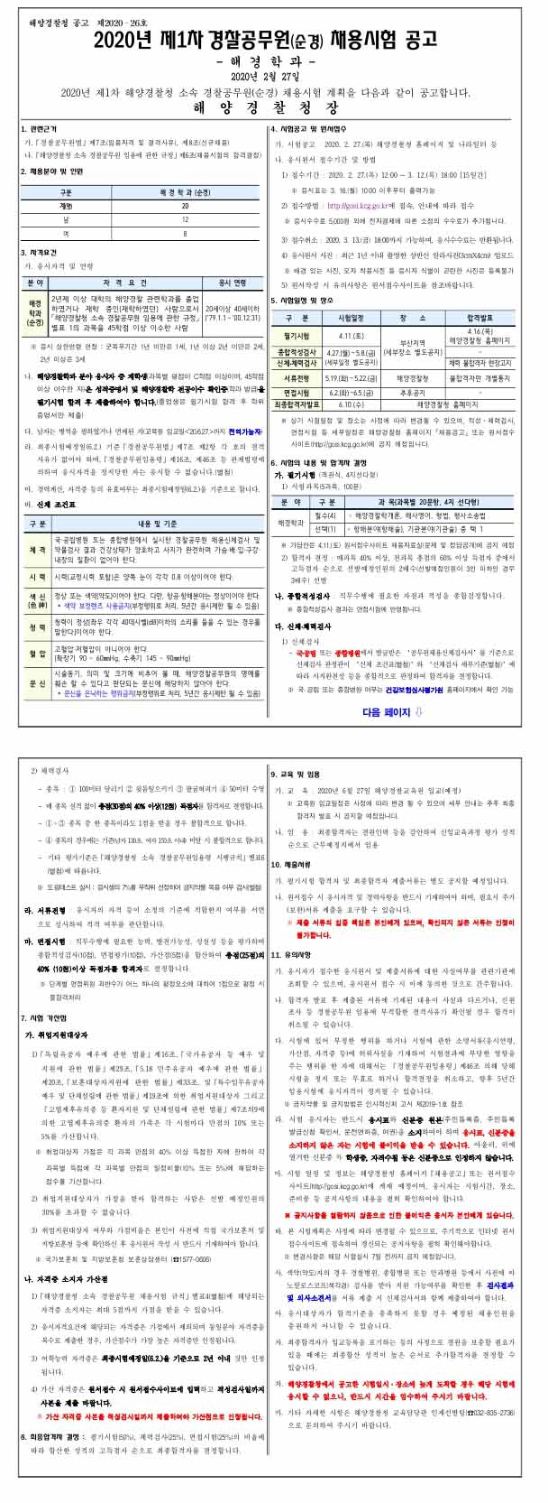 ☆ 2020 제1차 해양경찰청 경찰공무원(순경-해경학과) 채용시험 공고(~3.12) 페이지 정보 작성자 관리자 댓글 0건 조회 1,501회 작성일 20-02-28 15:37 목록 본문 [이 게시물은 관리자님에 의해 2020-02-28 15:44:04 최근시험공고문에서 복사 됨] 이전글2020 제1차 해양경찰청 경찰공무원(경위-항공조종) 채용시험 공고(~3.12) 20.02.28 다음글☆ 해양경찰청 소속 일반직공무원(장애인 구분모집 포함) 경력경쟁채용시험 공고(~3.12) 20.02.28 댓글 0 댓글목록 등록된 댓글이 없습니다.