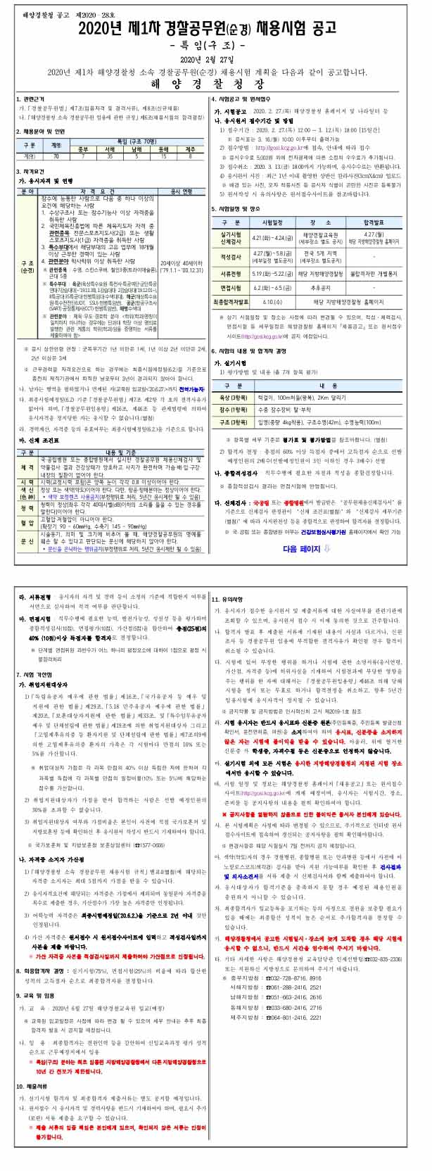 ☆ 2020 제1차 해양경찰청 경찰공무원(순경-구조) 채용시험 공고(~3.12) 페이지 정보 작성자 관리자 댓글 0건 조회 1,533회 작성일 20-02-28 15:40 목록 본문 [이 게시물은 관리자님에 의해 2020-02-28 15:44:04 최근시험공고문에서 복사 됨] 이전글☆ 2020 제1차 해양경찰청 경찰공무원(순경-구급) 채용시험 공고(~3.12) 20.02.28 다음글★ 2020 제1차 해양경찰청 경찰공무원(순경-함정요원) 채용시험 공고(~3.12) 20.02.28 댓글 0 댓글목록 등록된 댓글이 없습니다.