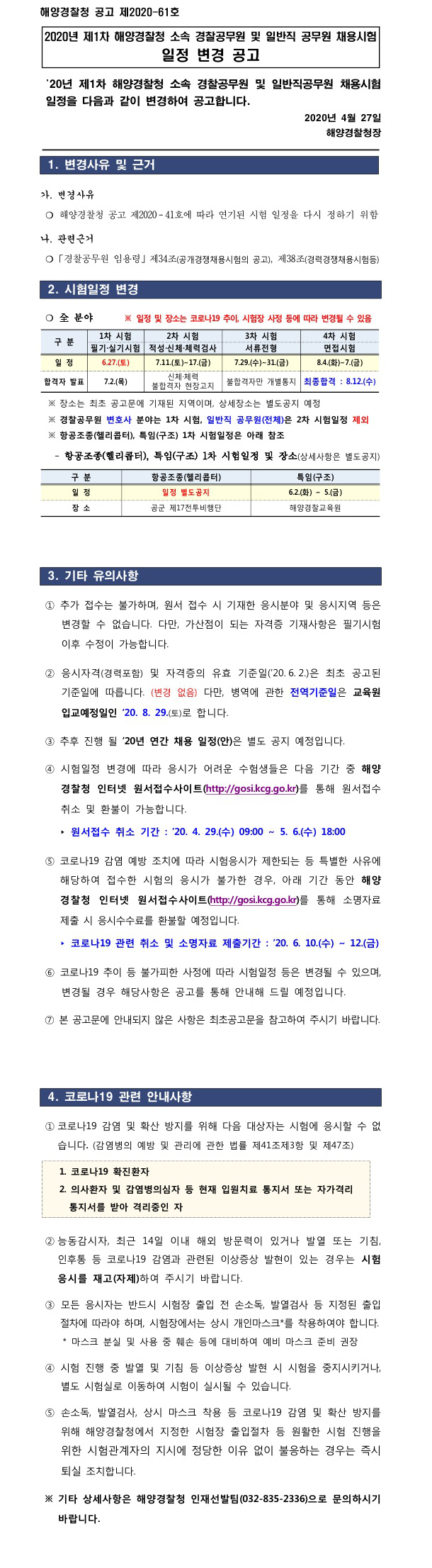 ★ 2020 제1차 해양경찰청 소속 경찰공무원 및 일반직 공무원 채용시험 일정 변경 공고 페이지 정보 작성자 관리자 댓글 0건 조회 1,635회 작성일 20-05-14 18:17 목록 본문 [이 게시물은 관리자님에 의해 2020-05-14 18:17:51 최근시험공고문에서 복사 됨] 이전글★ 2020 하반기 해양경찰청 소속 경찰공무원 채용시험 안내 20.05.14 다음글★ 2020 경찰청 경찰공무원 제1차 순경 공채시험, 상반기 경채시험 일정 변경 공고 20.04.27 댓글 0 댓글목록 등록된 댓글이 없습니다.
