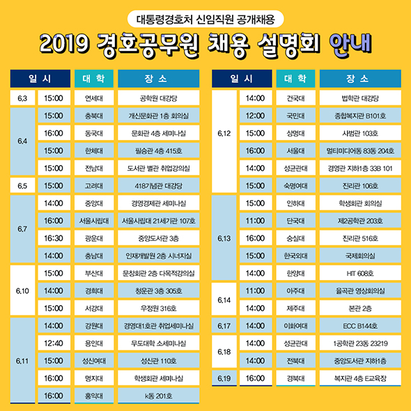 2019 대통령경호처 경호공무원 채용 설명회 안내 페이지 정보 작성자 관리자 댓글 0건 조회 1,148회 작성일 19-06-07 14:31 목록 본문 [이 게시물은 관리자님에 의해 2019-06-07 14:33:11 최근시험공고문에서 복사 됨] 이전글2019 경찰청 무도분야 경찰공무원 경력경쟁채용시험 채용계획 및 일정 등 공고 19.06.25 다음글★ 2019 제2차 해양경찰청 소속 경찰공무원 채용 공고(~6.3) 19.06.01 댓글 0 댓글목록 등록된 댓글이 없습니다.
