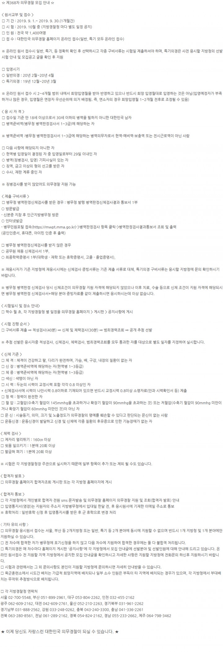 제368차 경찰청 의무경찰 모집 공고(~9.30) 페이지 정보 작성자 관리자 댓글 0건 조회 1,432회 작성일 19-09-04 17:47 목록 본문 [이 게시물은 관리자님에 의해 2019-09-04 17:48:06 최근시험공고문에서 복사 됨] 이전글★ 2020 국가공무원 충원계획 정부(안) 확정 19.09.04 다음글전남 청원경찰 채용시험 시행계획 공고(~10.25) 19.09.04 댓글 0 댓글목록 등록된 댓글이 없습니다.