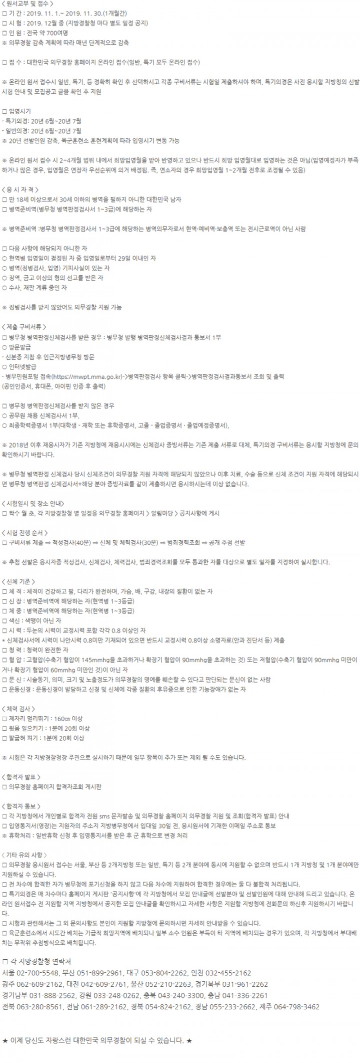 제369차 경찰청 의무경찰 모집 공고(~11.30) 페이지 정보 작성자 관리자 댓글 0건 조회 1,475회 작성일 19-11-07 08:35 목록 본문 [이 게시물은 관리자님에 의해 2019-11-07 08:35:10 최근시험공고문에서 복사 됨] 이전글경찰청 일반직 및 임기제공무원 경력경쟁채용 공고(~11.29) 19.11.20 다음글해양경찰청 2019 제3차 경찰공무원 채용 및 2020 간부후보생 선발 필기(실기)시험 합격자 19.10.16 댓글 0 댓글목록 등록된 댓글이 없습니다.