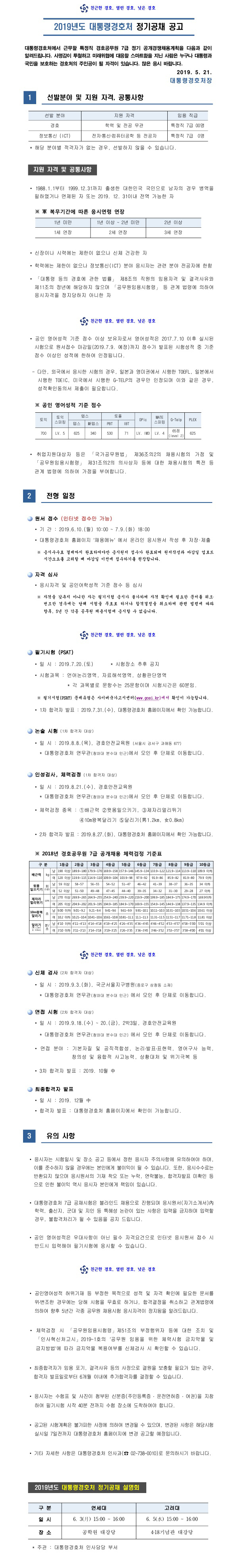 ★ 2019 대통령경호처 7급 공무원 정기공채 공고(~7.9) 페이지 정보 작성자 관리자 댓글 0건 조회 1,136회 작성일 19-05-22 17:47 목록 본문 [이 게시물은 관리자님에 의해 2019-05-22 17:48:13 최근시험공고문에서 복사 됨] 이전글★ 2019 국회사무처 시행 9급 공개경쟁채용시험 공고(~5.24) 19.05.24 다음글기상청 청원경찰 공개채용시험 공고(~6.5) 19.05.22 댓글 0 댓글목록 등록된 댓글이 없습니다.