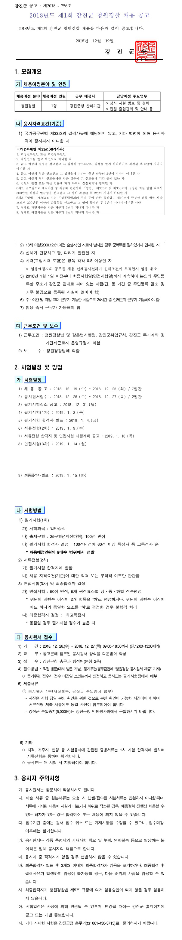 전남 강진군 청원경찰 채용 공고(~12.27) 페이지 정보 작성자 관리자 댓글 0건 조회 1,198회 작성일 18-12-28 21:01 목록 본문 [이 게시물은 관리자님에 의해 2018-12-28 21:01:36 최근시험공고문에서 복사 됨] 이전글광주시 북구 청원경찰 임용시험 시행계획 공고(~1.9) 18.12.28 다음글영산강유역환경청 방호직공무원 경력경쟁채용시험 공고(~12.31) 18.12.28 댓글 0 댓글목록 등록된 댓글이 없습니다.