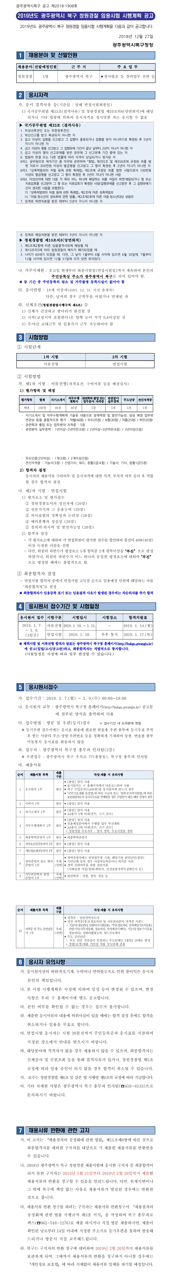 광주시 북구 청원경찰 임용시험 시행계획 공고(~1.9) 페이지 정보 작성자 관리자 댓글 0건 조회 1,190회 작성일 18-12-28 21:12 목록 본문 [이 게시물은 관리자님에 의해 2018-12-28 21:12:24 최근시험공고문에서 복사 됨] 이전글☆ 2019 제1회 경찰청 일반직공무원 경력경쟁채용시험 공고(~1.18) 19.01.03 다음글전남 강진군 청원경찰 채용 공고(~12.27) 18.12.28 댓글 0 댓글목록 등록된 댓글이 없습니다.