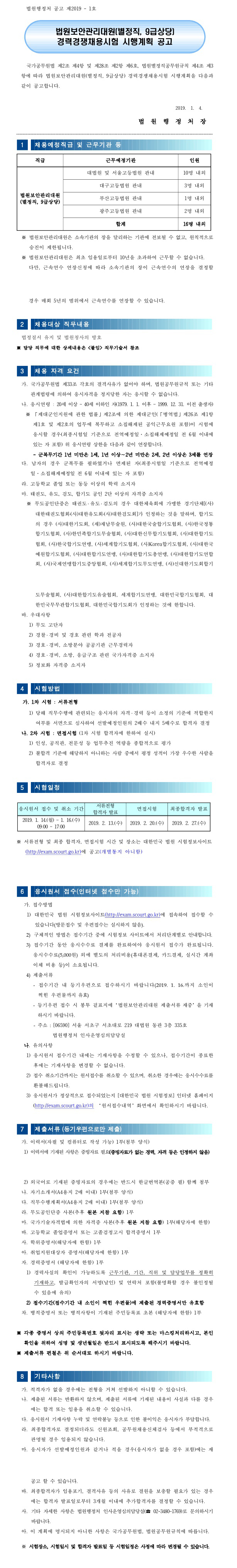 법원행정처 법원보안관리대원(별정직, 9급상당) 경력경쟁채용시험 시행계획 공고(~1.16) 페이지 정보 작성자 관리자 댓글 0건 조회 1,221회 작성일 19-01-07 18:50 목록 본문 [이 게시물은 관리자님에 의해 2019-01-07 18:50:51 최근시험공고문에서 복사 됨] 이전글2019 제1차 해양경찰청 의무경찰 모집 공고(~1.23) 19.01.07 다음글[2019 일정] ★ 2019 경찰청 경찰공무원 채용시험 계획 19.01.07 댓글 0 댓글목록 등록된 댓글이 없습니다.