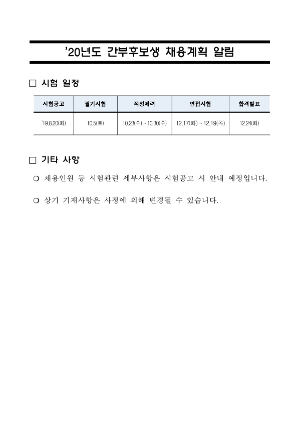 2020 해양경찰청 간부후보생 채용계획 알림 페이지 정보 작성자 관리자 댓글 0건 조회 1,292회 작성일 19-01-15 21:13 목록 본문 [이 게시물은 관리자님에 의해 2019-01-15 21:13:34 최근시험공고문에서 복사 됨] 이전글2019 경찰청 경력경쟁채용시험 시행계획 안내 19.01.15 다음글★ 2019 해양경찰청 변경되는 채용 제도 19.01.15 댓글 0 댓글목록 등록된 댓글이 없습니다.