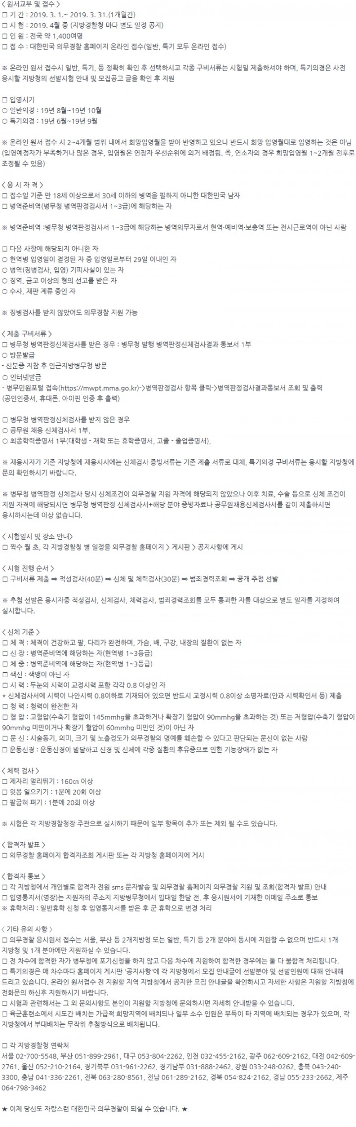 제364차 경찰청 의무경찰 모집 안내(~3.31) 페이지 정보 작성자 관리자 댓글 0건 조회 1,230회 작성일 19-03-04 12:16 목록 본문 [이 게시물은 관리자님에 의해 2019-03-04 12:16:46 최근시험공고문에서 복사 됨] 이전글2019 제3차 해양경찰청 의무경찰(398기) 모집 공고(~4.3) 19.03.18 다음글★ 2019 제1차 해양경찰청 경찰공무원(순경-함정요원) 채용시험 공고(~3.11) 19.03.04 댓글 0 댓글목록 등록된 댓글이 없습니다.