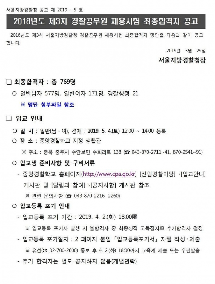 [서울] 2018년도 제3차 경찰공무원 채용시험 최종합격자 공고