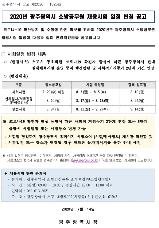 2020년 광주광역시 소방공무원 채용시험 일정 변경 공고