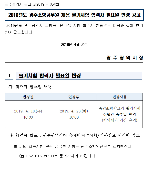 ★ 2019 광주시 소방공무원 채용 필기시험 합격자 발표일 변경 공고 페이지 정보 작성자 관리자 댓글 0건 조회 1,553회 작성일 19-04-03 18:39 목록 본문 [이 게시물은 관리자님에 의해 2019-04-10 17:36:51 최근시험공고문에서 복사 됨] 이전글2019 제1회 전남 지방소방공무원 채용 필기(실기)시험 합격자 및 체력시험 공고 19.04.19 다음글2019 경기도 소방공무원 신규채용 필기시험 장소 등 공고 19.03.29 댓글 0 댓글목록 등록된 댓글이 없습니다.