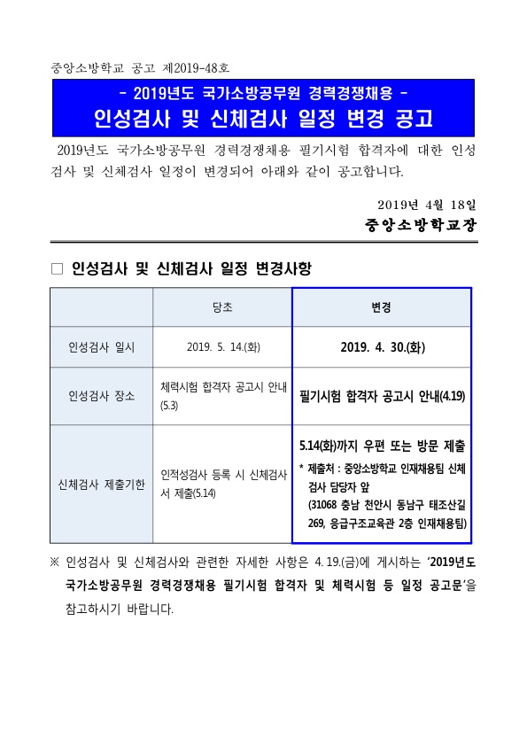 ☆ 2019 중앙소방학교 국가소방공무원 경력경쟁채용 인성검사 및 신체검사 일정 변경 공고 페이지 정보 작성자 관리자 댓글 0건 조회 1,562회 작성일 19-04-22 17:24 목록 본문 [이 게시물은 관리자님에 의해 2019-04-22 17:24:30 최근시험공고문에서 복사 됨] 이전글2019 중앙소방학교 국가소방공무원 경력경쟁채용 필기시험 합격자 및 체력시험 등 일정 19.04.22 다음글2019 제1회 전남 지방소방공무원 채용 필기(실기)시험 합격자 및 체력시험 공고 19.04.19 댓글 0 댓글목록 등록된 댓글이 없습니다.