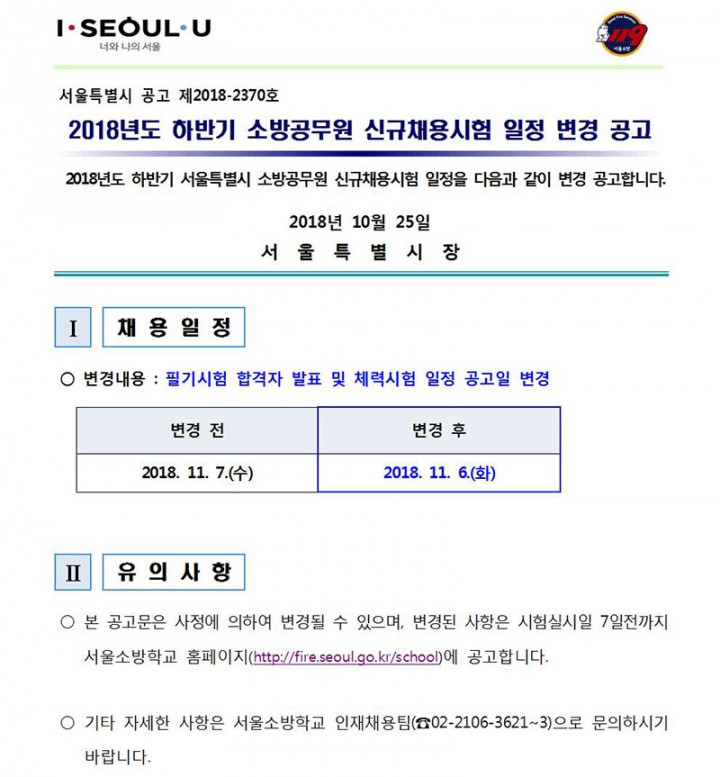 ★ 2018 하반기 서울시 소방공무원 신규채용시험 일정 변경 공고 페이지 정보 작성자 관리자 댓글 0건 조회 1,249회 작성일 18-10-30 12:06 목록 본문 [이 게시물은 관리자님에 의해 2018-10-30 12:06:09 최근시험공고문에서 복사 됨] 이전글★ 2018 하반기 서울시 소방공무원 신규채용 필기시험 응시율 18.10.30 다음글★2018 제2회 전남 지방소방공무원 채용 필기시험 합격선 18.10.29 댓글 0 댓글목록 등록된 댓글이 없습니다.