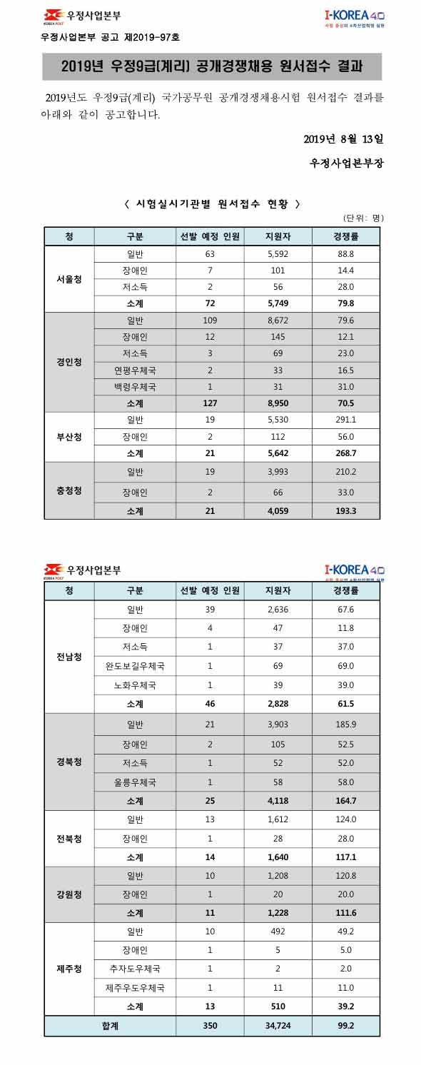 ★ 2019 우정사업본부 우정9급(계리) 공개경쟁채용시험 경쟁률 페이지 정보 작성자 관리자 댓글 0건 조회 1,680회 작성일 19-10-10 17:30 목록 본문 [이 게시물은 관리자님에 의해 2019-10-10 17:31:34 최근시험공고문에서 복사 됨] 이전글★ 2019 각 시.도 지방공무원 7급 공채시험 경쟁률 19.10.10 다음글★ 2019 국회사무처 시행 9급 공개경쟁채용시험 필기시험 합격선 19.10.02 댓글 0 댓글목록 등록된 댓글이 없습니다.