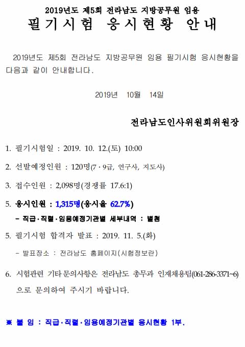 ★ 2019 제5회 전남 지방공무원 임용 필기시험 응시율 페이지 정보 작성자 관리자 댓글 0건 조회 1,461회 작성일 19-10-16 08:25 목록 본문 [이 게시물은 관리자님에 의해 2019-10-16 08:27:52 최근시험공고문에서 복사 됨] 이전글★ 2019 제2회 광주시 지방공무원(행정7급 등) 필기시험 응시율 19.10.16 다음글★ 2020 경찰청 경찰간부후보생(69기) 선발시험 경쟁률 및 합격선 19.10.16 댓글 0 댓글목록 등록된 댓글이 없습니다.