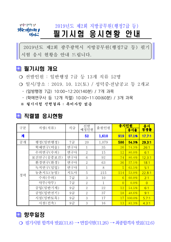 ★ 2019 제2회 광주시 지방공무원(행정7급 등) 필기시험 응시율 페이지 정보 작성자 관리자 댓글 0건 조회 1,439회 작성일 19-10-16 08:27 목록 본문 [이 게시물은 관리자님에 의해 2019-10-16 08:27:52 최근시험공고문에서 복사 됨] 이전글★ 2019 제2차 공군 일반군무원 공개경쟁채용시험 경쟁률 19.10.24 다음글★ 2019 제5회 전남 지방공무원 임용 필기시험 응시율 19.10.16 댓글 0 댓글목록 등록된 댓글이 없습니다.