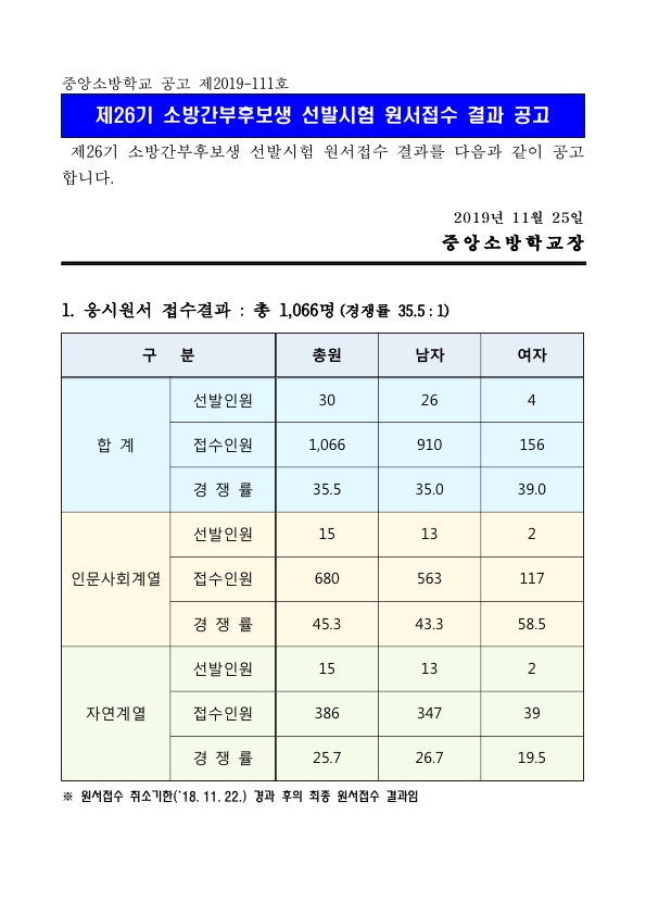 제26기 중앙소방학교 소방간부후보생 선발시험 경쟁률 페이지 정보 작성자 관리자 댓글 0건 조회 1,685회 작성일 19-12-02 16:18 목록 본문 [이 게시물은 관리자님에 의해 2019-12-02 16:18:25 최근시험공고문에서 복사 됨] 이전글★ 2019 제6회 전남 지방공무원 임용 제1·2차 필기시험 합격선 19.12.02 다음글★ 2019 전남지방우정청 우정9급(계리) 공무원 공개경쟁채용 필기시험 합격선 19.11.20 댓글 0 댓글목록 등록된 댓글이 없습니다.