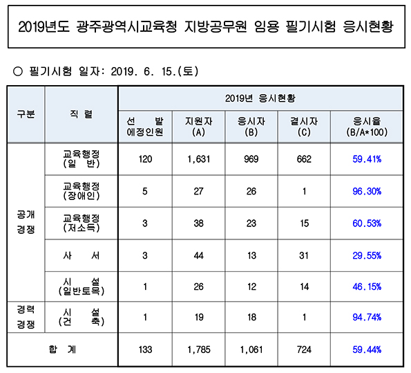 ★ 2019 광주시교육청 지방공무원 임용 필기시험 응시율 페이지 정보 작성자 관리자 댓글 0건 조회 1,478회 작성일 19-06-18 19:32 목록 본문 [이 게시물은 관리자님에 의해 2019-06-18 19:33:15 최근시험공고문에서 복사 됨] 이전글★ 2019 전남교육청 지방공무원 공개(경력)경쟁 임용 필기시험 응시율 19.06.18 다음글★ 2019 제1회 광주시 지방공무원 임용시험(8·9급) 응시율 19.06.18 댓글 0 댓글목록 등록된 댓글이 없습니다.