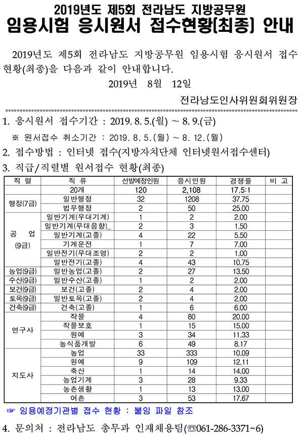 ★ 2019 제5회 전남 지방공무원 임용시험 응시원서 경쟁률 페이지 정보 작성자 관리자 댓글 0건 조회 1,614회 작성일 19-08-14 08:49 목록 본문 [이 게시물은 관리자님에 의해 2019-08-14 08:49:19 최근시험공고문에서 복사 됨] 이전글★ 2019 제2회 광주시 지방공무원 임용시험(7급 등) 직렬(류)별 응시원서 경쟁률 19.08.14 다음글★ 2019 국회사무처 9급 공개경쟁채용시험 경쟁률(변경) 19.08.09 댓글 0 댓글목록 등록된 댓글이 없습니다.