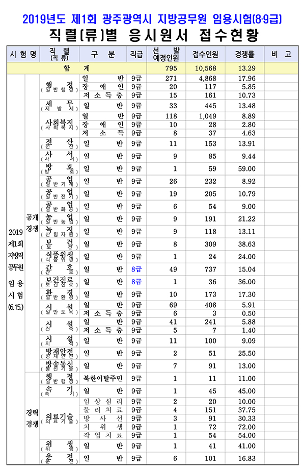 ★ 2019 제1회 광주시 지방공무원 임용시험(8·9급) 직렬(류)별 경쟁률(최종) 페이지 정보 작성자 관리자 댓글 0건 조회 1,859회 작성일 19-04-16 19:20 목록 본문 [이 게시물은 관리자님에 의해 2019-04-16 19:21:30 최근시험공고문에서 복사 됨] 이전글★ 2019 제1회 전남 지방소방공무원 채용 제1차 필기(실기)시험 합격선 19.04.19 다음글★ 2019 제4회 전남 지방공무원 임용시험 경쟁률 19.04.15 댓글 0 댓글목록 등록된 댓글이 없습니다.