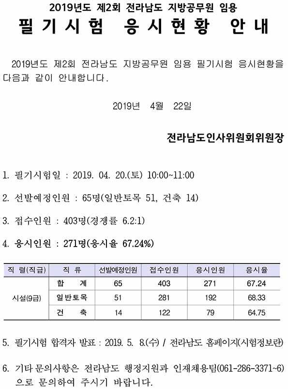 ★ 2019 제2회 전남 지방공무원 임용 필기시험 응시율 페이지 정보 작성자 관리자 댓글 0건 조회 1,548회 작성일 19-04-22 17:34 목록 본문 [이 게시물은 관리자님에 의해 2019-04-22 17:34:47 최근시험공고문에서 복사 됨] 이전글★ 2019 서울시 소방공무원 신규채용 필기시험 합격선 19.04.23 다음글☆ 2019 중앙소방학교 국가소방공무원 경력경쟁채용 필기시험 합격선 19.04.22 댓글 0 댓글목록 등록된 댓글이 없습니다.