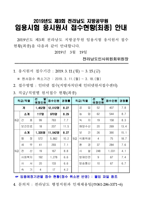 2019년도 제3회 전라남도 지방공무원 임용시험 응시원서 접수현황(최종) 안내