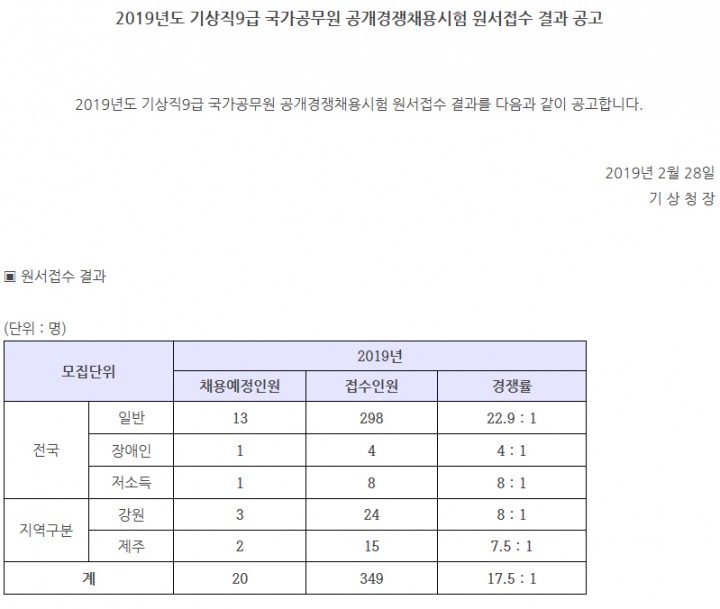 ☆ 2019 기상청 기상직 9급 국가공무원 공개경쟁채용시험 경쟁률 페이지 정보 작성자 관리자 댓글 0건 조회 1,915회 작성일 19-03-04 12:21 목록 본문 [이 게시물은 관리자님에 의해 2019-03-04 12:21:25 최근시험공고문에서 복사 됨] 이전글★ 2019 제1회 전남 지방소방공무원 채용시험 경쟁률(최종) 19.03.07 다음글★ 2019 제1회 전남 지방소방공무원 채용시험 경쟁률 19.03.04 댓글 0 댓글목록 등록된 댓글이 없습니다.