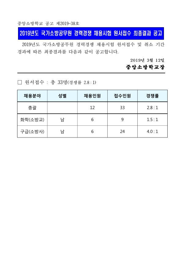 ☆ 2019 중앙소방학교 국가소방공무원 경력경쟁 채용시험 경쟁률 페이지 정보 작성자 관리자 댓글 0건 조회 1,939회 작성일 19-03-13 16:22 목록 본문 [이 게시물은 관리자님에 의해 2019-03-13 16:22:35 최근시험공고문에서 복사 됨] 이전글★ 2019 제1차 해양경찰청 경찰공무원 및 일반직공무원 채용시험 경쟁률 19.03.13 다음글★ 2019 인사혁신처 국가공무원 9급 공채시험 경쟁률 19.03.07 댓글 0 댓글목록 등록된 댓글이 없습니다.