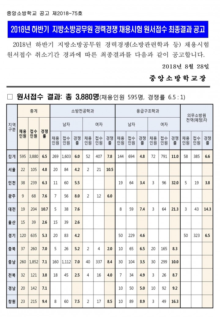 ☆ 2018 하반기 중앙소방학교 지방소방공무원 경력경쟁 채용시험 경쟁률(최종) 페이지 정보 작성자 관리자 댓글 0건 조회 1,593회 작성일 18-08-29 16:37 목록 본문 [이 게시물은 관리자님에 의해 2018-08-29 16:37:53 최근시험공고문에서 복사 됨] 이전글☆ 2018 하반기 중앙소방학교 국가소방공무원 경력경쟁 채용시험 경쟁률(최종) 18.08.29 다음글★ 2018 제2회 서울시 지방공무원 공개경쟁 임용 필기시험 합격선 18.08.22 댓글 0 댓글목록 등록된 댓글이 없습니다.